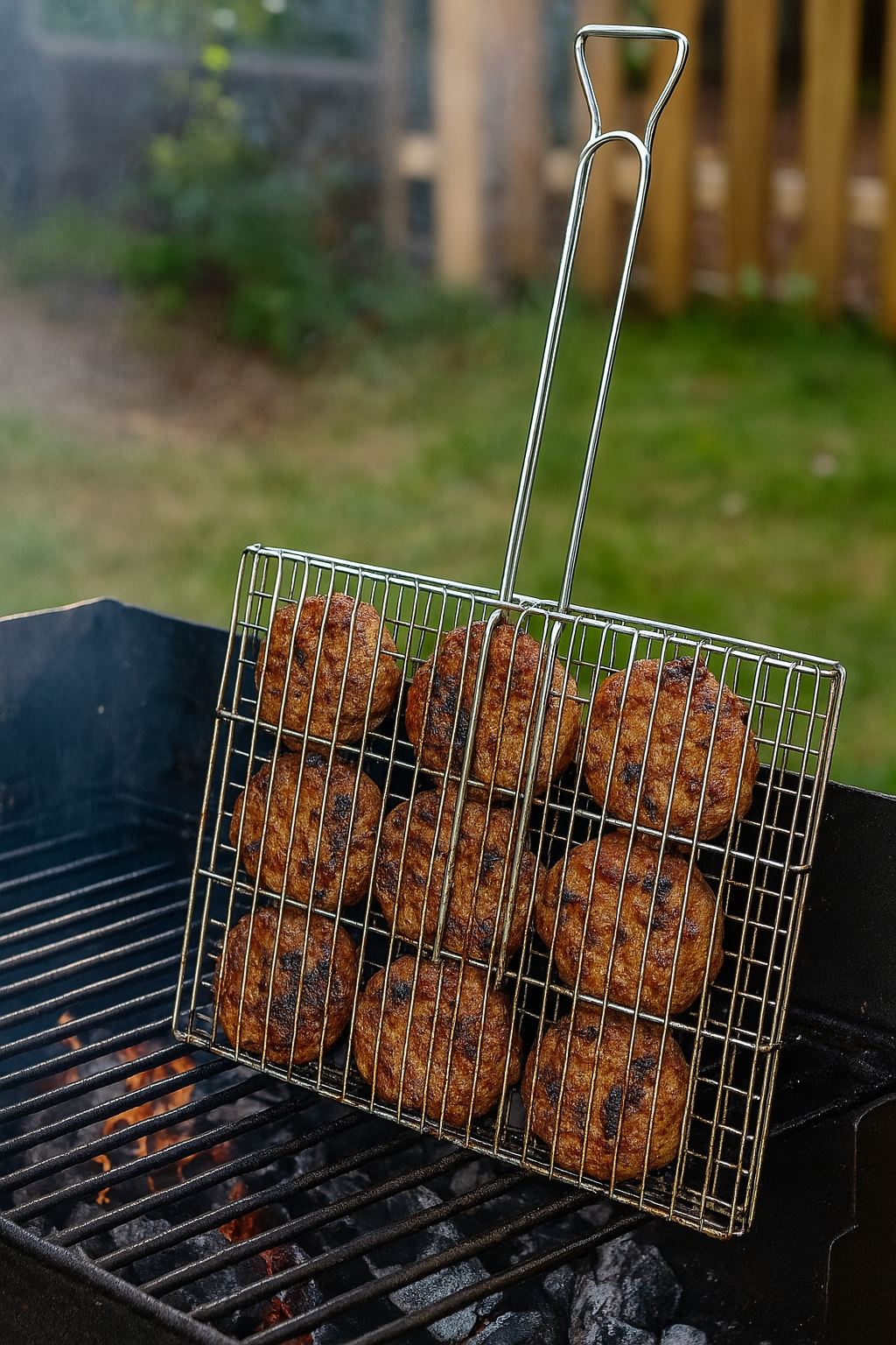 The Multi-purpose Flat Grill Basket is crafted from durable 430 stainless steel and measures 75 cm by 45 cm by 35 cm. It features wire thicknesses of 7.0 mm, 5.0 mm, and 3.0 mm, with an adjustable wire spacing of 10 mm. The basket has a total height of 2.4 cm and weighs approximately 2.7 kg, making it a sturdy and versatile accessory for grilling.