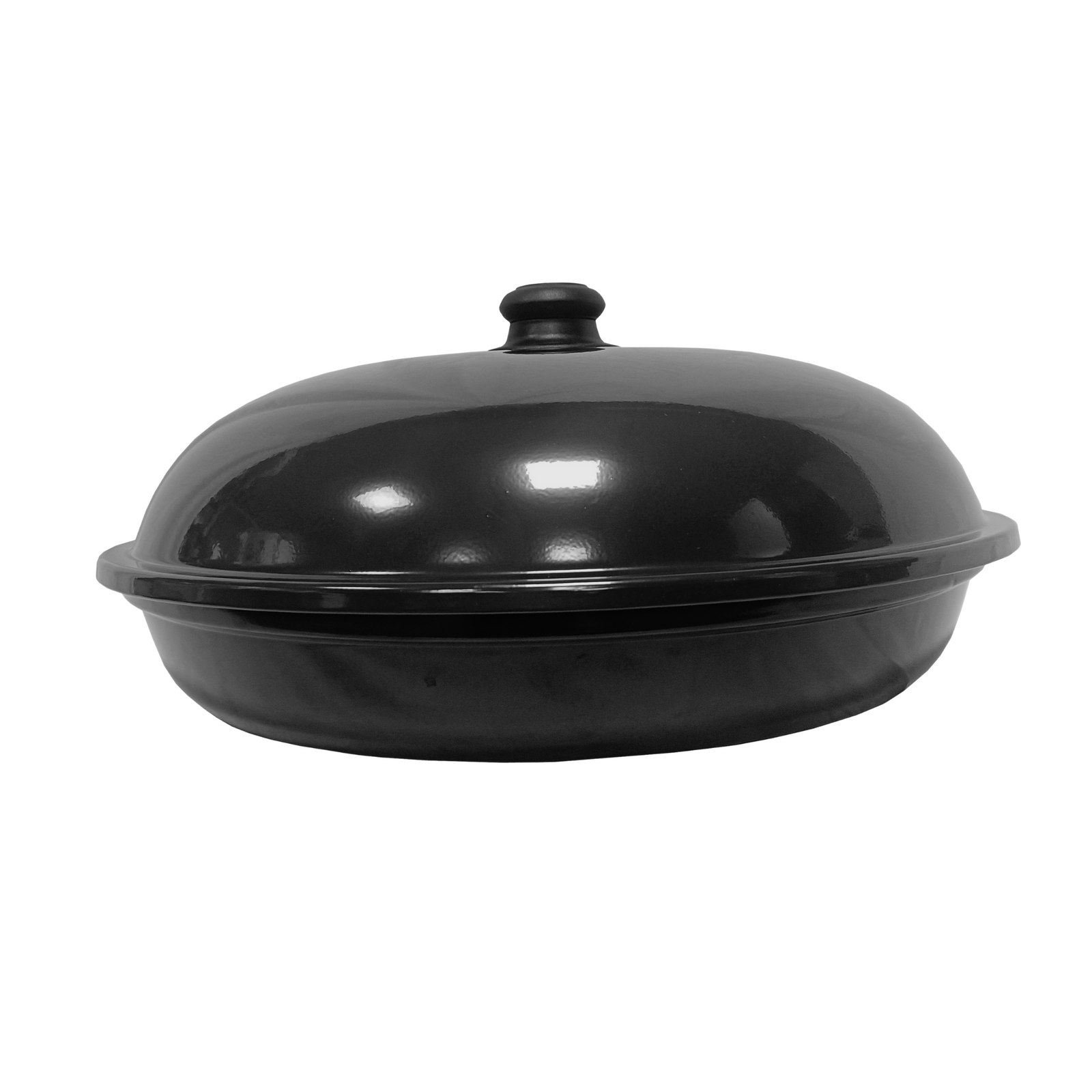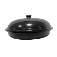 Enamel base with powder-coated top and hi-lid Keeps hot food covered, warm, and protected from flies Drains fat for healthier eating Includes wire rack ideal as a cake cooling tray Size: 42mm diameter x 150mm height