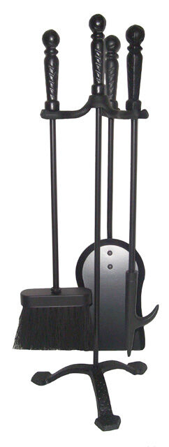 Black finish Tools (53 cm long): Poker, heat-resistant brush, shovel, tongs Wall mount plate: 40 cm L x 4 cm H x 0.5 mm thick steel