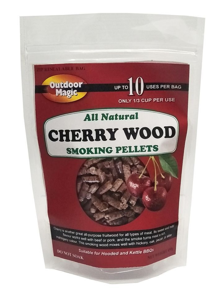All-Natural Smoking Pellets 450g zip-lock bag – up to 10 uses No soaking required Produces smoke for up to 30 mins per 45g Ideal for hot or cold smoking Use with Outdoor Magic Smoker Box (OMV2019) or Smoker Tubes (PSMT300 / PSMT150) Cherry Smoking Wood Sweet, mild flavour – great all-purpose choice Pairs well with beef, pork, and more Produces a rich mahogany colour on meat Mixes well with hickory, oak, pecan, or alder