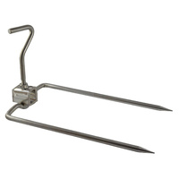 The Spit Roast Prongs with Square Shaft Collar are sold as a set of two and are made from 304 food-grade stainless steel. Each prong features a 22 mm shaft collar and measures 123 mm by 230 mm in length, with a thickness of 8 mm, providing strong and reliable support for meat during spit roasting.