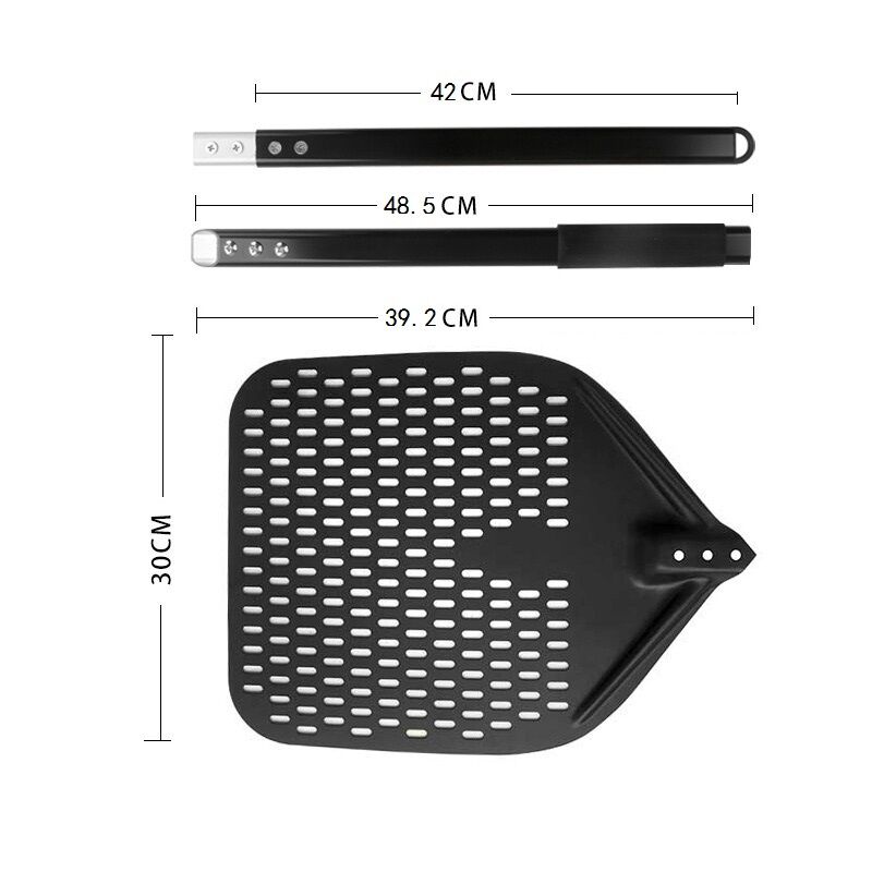 Perforated blade: 300 x 355mm Lightweight aluminum alloy handle with black finish 2-piece detachable handle for compact transport Secured with 3 screws for added stability Anodized surface for safety and durability Smooth handle prevents dirt buildup Protective end covers to avoid shipping damage