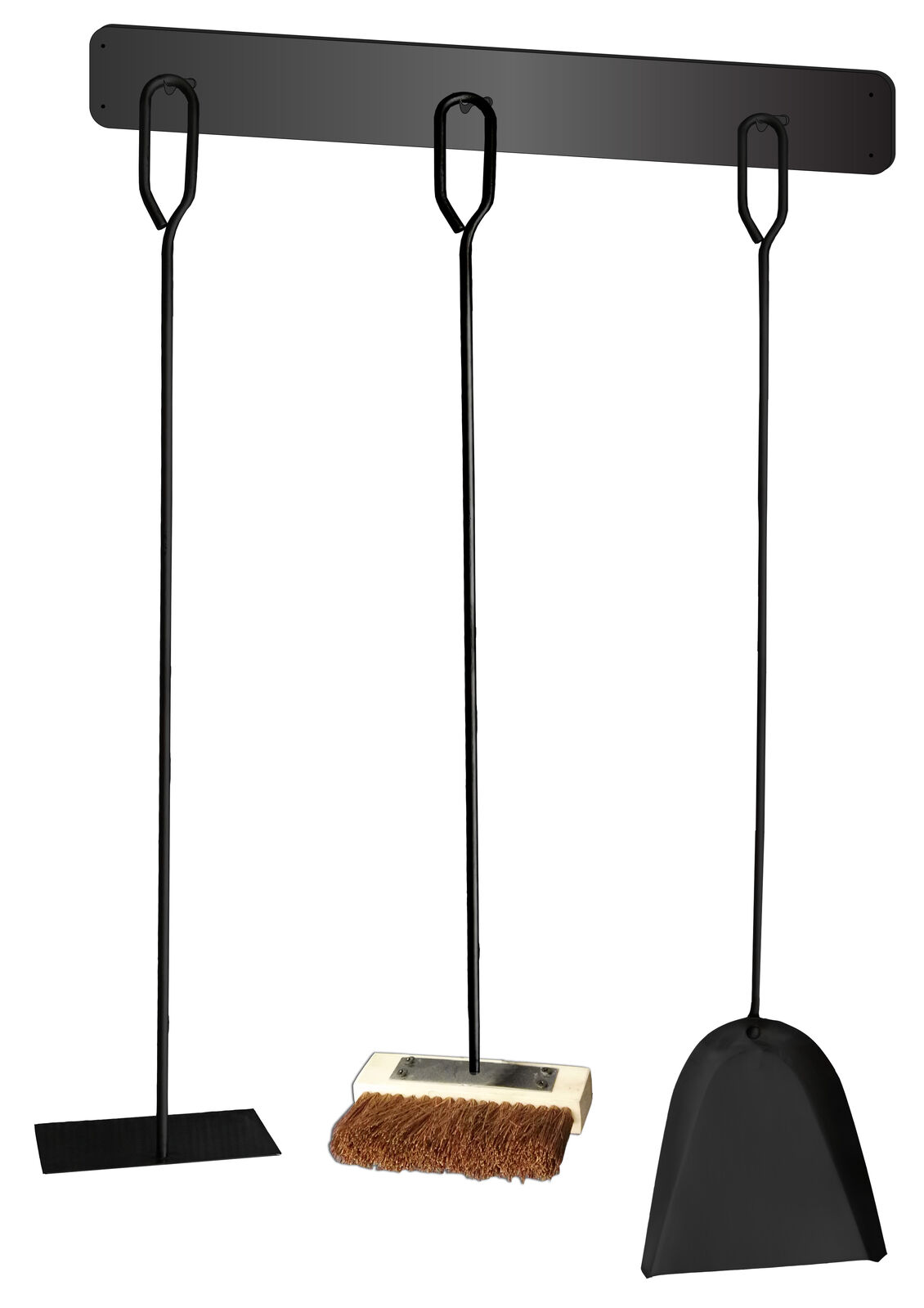Includes 750mm x 8mm dia L-handle rake, shovel, and brush 3-piece wall mount bracket Made from food-grade black powder-coated steel Includes 4 stainless steel screws (35mm x 10g) and wall plugs Rack size: 600mm wide x 75mm high