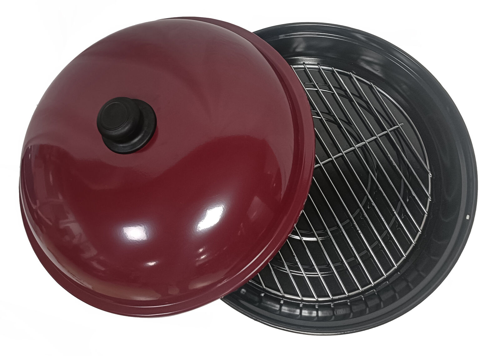 Enamel base with powder-coated top and hi-lid Keeps hot food covered, warm, and protected from flies Drains fat for healthier eating Includes wire rack ideal as a cake cooling tray Size: 42mm diameter x 150mm height